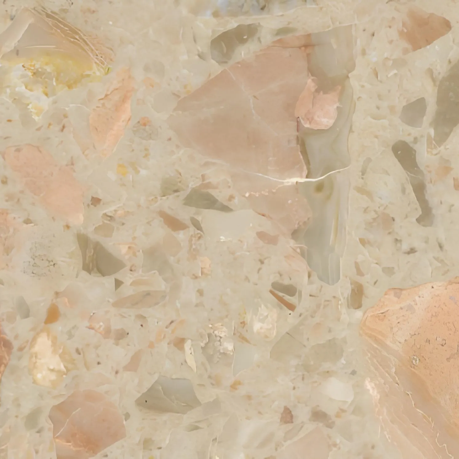 Terrazzo med store flerfargede marmorsteiner bundet i brun resin
