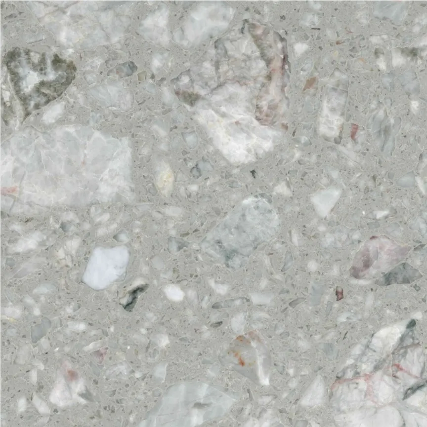 Terrazzo med store flerfargede grålige marmorsteiner bundet i lys grå resin