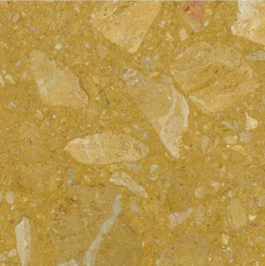 Terrazzo med store flerfargede gule marmorsteiner bundet i gul resin