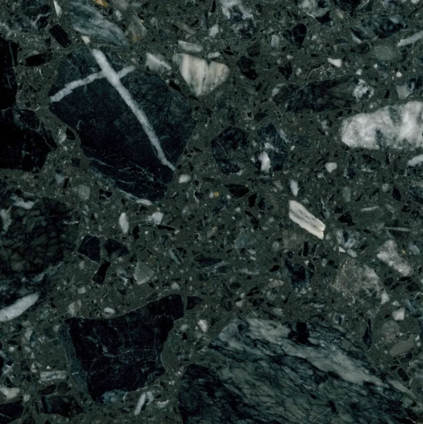 Terrazzo med store mørke flerfargede marmorsteiner bundet i koksgrå resin
