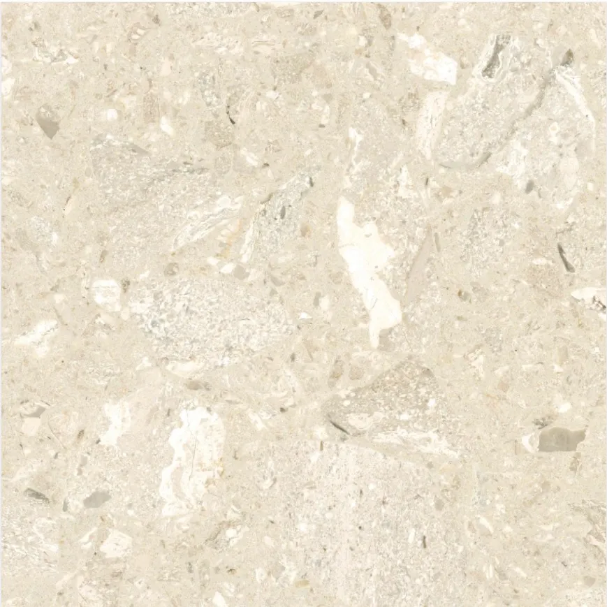 Terrazzo med store flerfargede beige marmorsteiner bundet i kremfarget resin