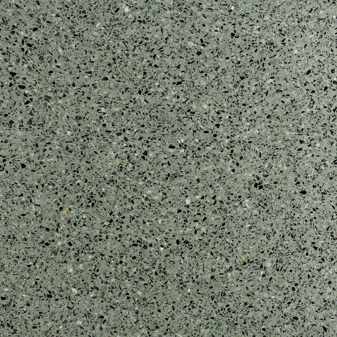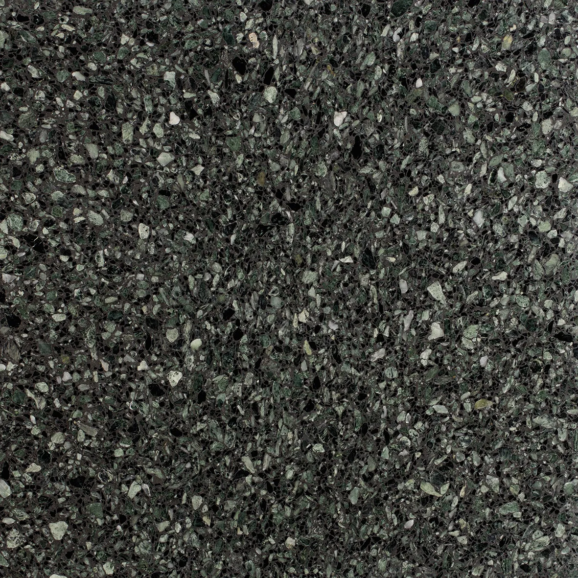 Terrazzo med grønt og sort tilslag bundet i mørkegrå sement